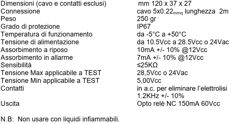 La sensibilità del rivelatore è =25KO, la presenza di una resistenza in questo range di valori provoca la caduta di un opto relè a sicurezza ativa che passa da contatto chiuso ad aperto.